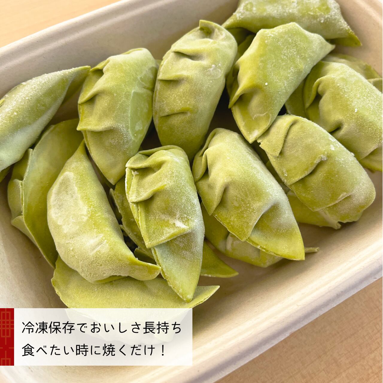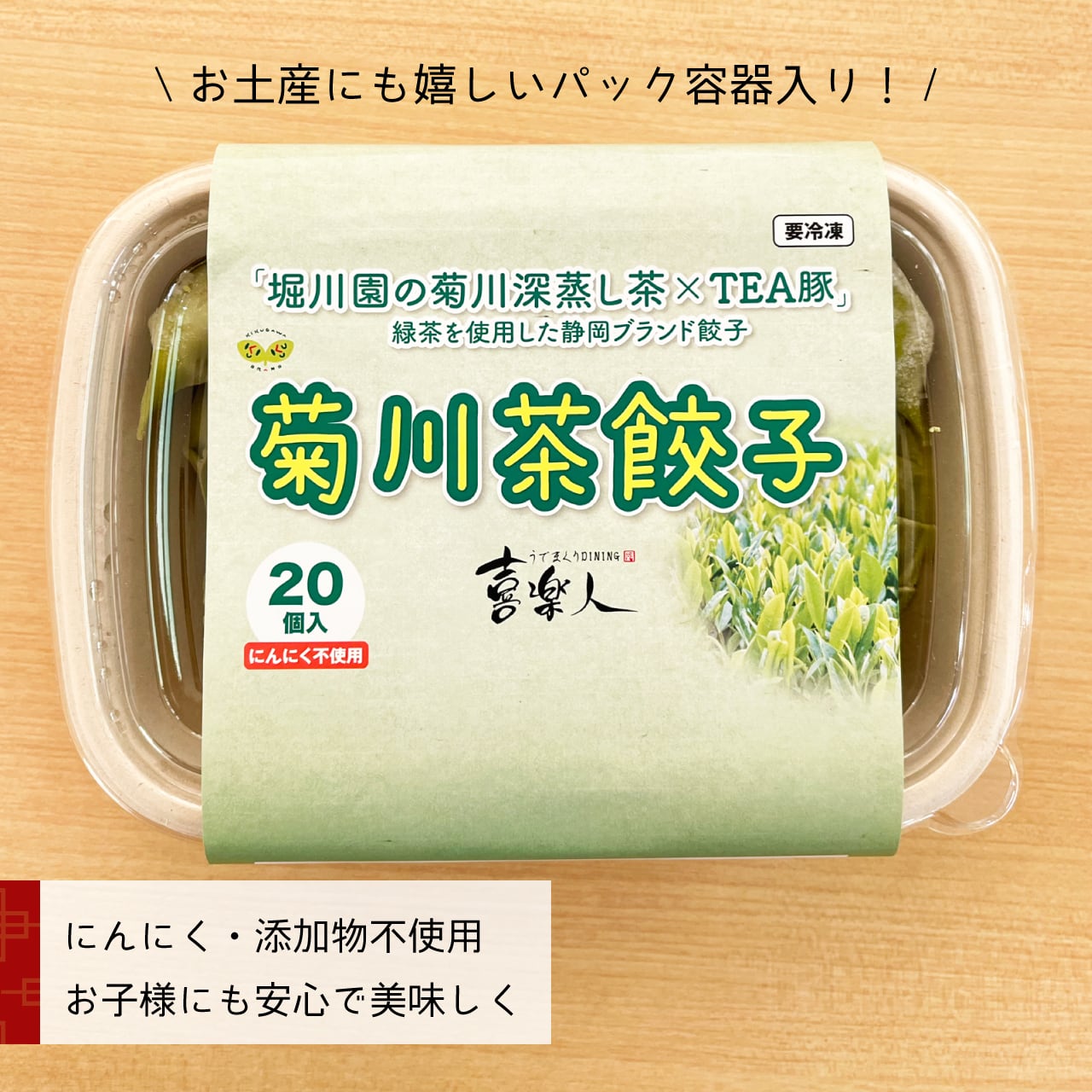 原材料:【餡】TEA豚、キャベツ、ニラ、蓮根、醤油、塩、故障、胡麻油、チキンスープ【皮】小麦粉、菊川産深蒸し茶