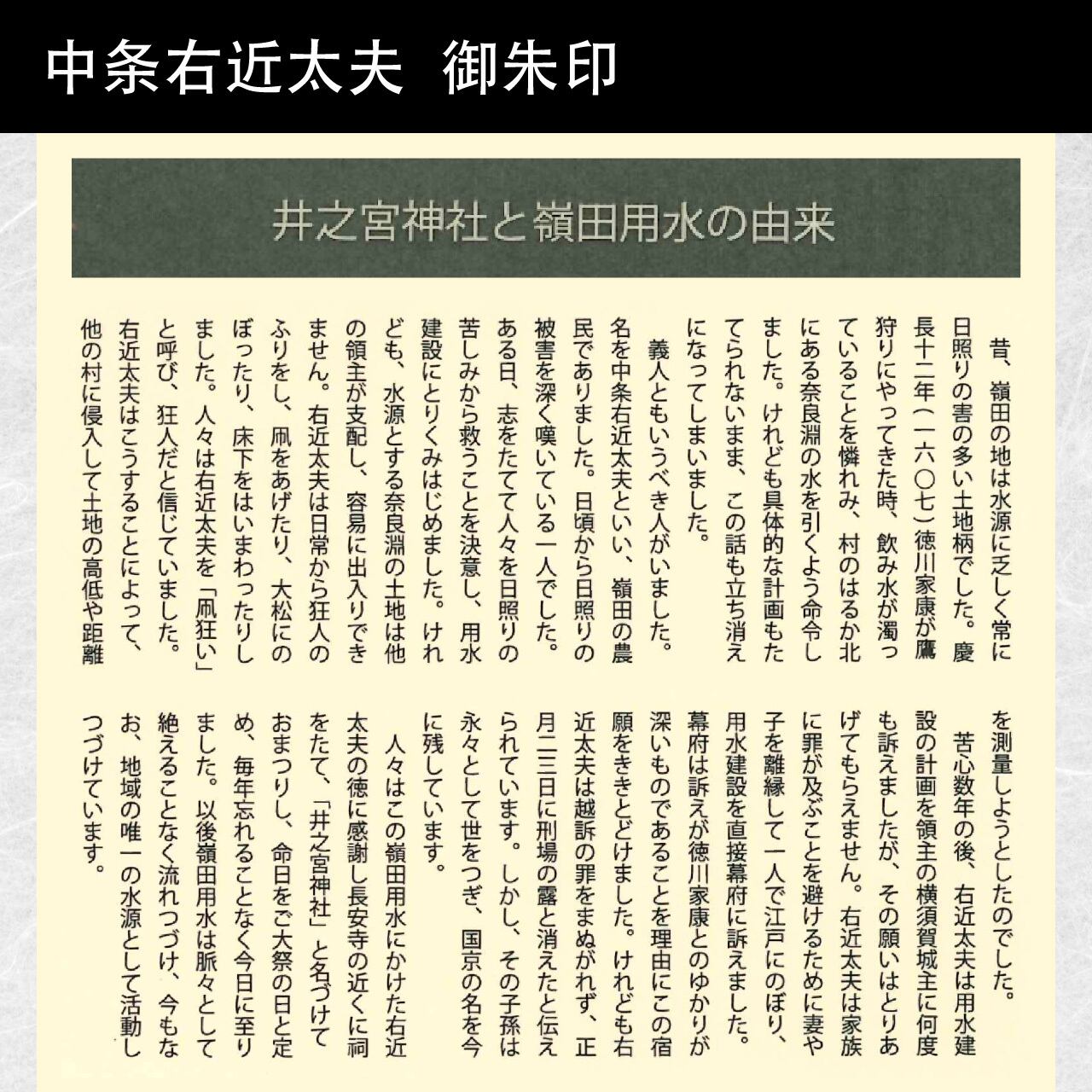 江戸時代、水不足に苦しんでいた嶺田地区で、村人たちの生活を守りたいという強い思いから中条右近太夫は、狂人のふりをして測量を行い、用水路開削を何度も願い出、ついには幕府に直訴。願いは叶えられたものの、彼は処刑されてしまいます。彼の犠牲によって完成した嶺田用水は、今も地域を潤しています。この度、没後400年を迎え、彼の偉業を称える祭祀も開催されています。