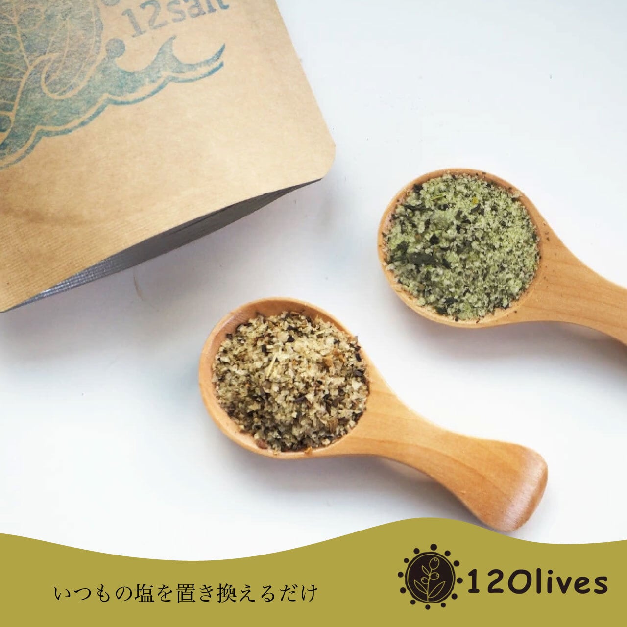 12Olivesの農園で剪定した国産の「オリーブの葉」と、厳選された「静岡産ソルト」を配合した商品です。バジル、ガーリックパウダー、ブラックペッパーなどのハーブやスパイスを配合し、お肉はもちろん、サラダや和食にも「ひとふり」で味がワンランクUPします。